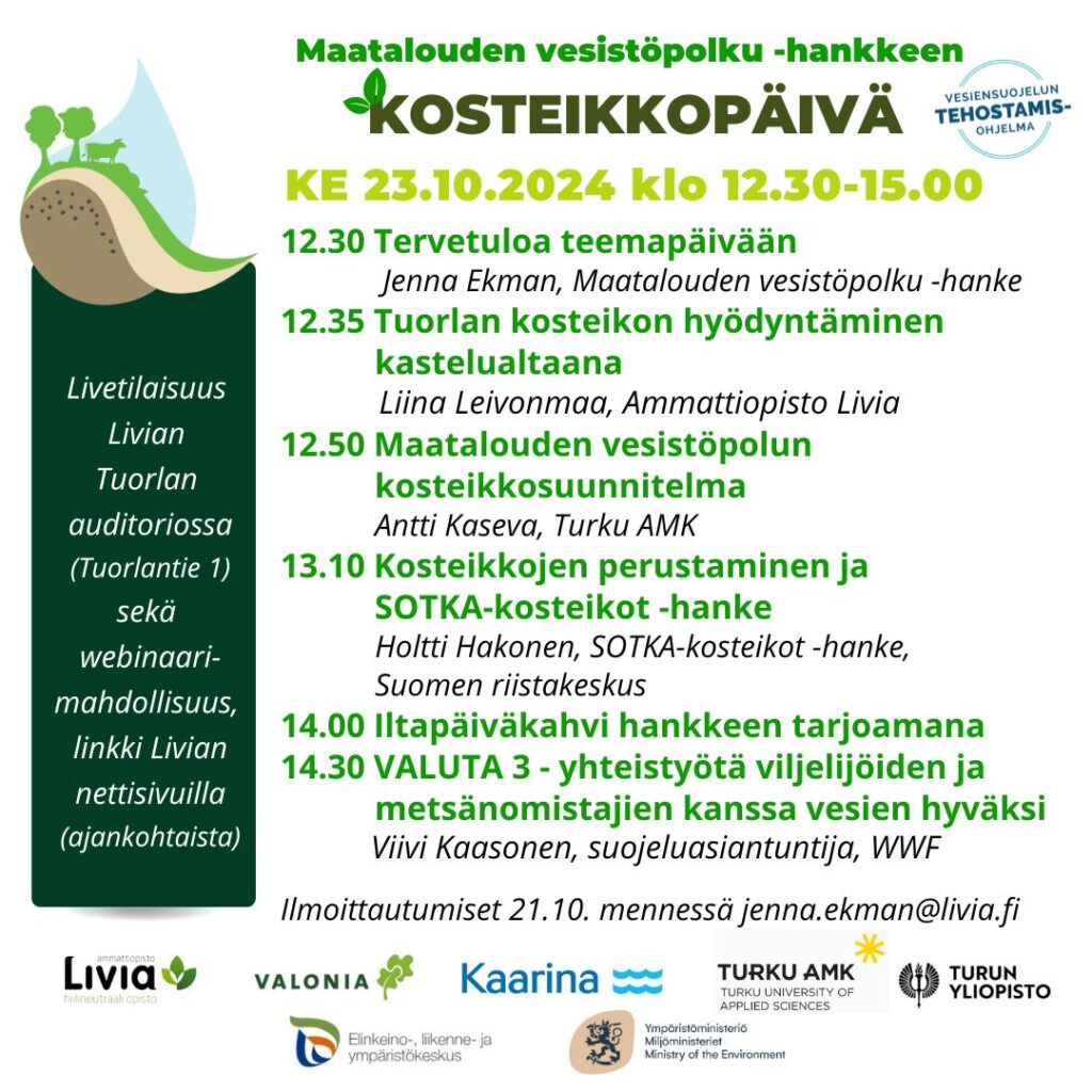 Tervetuloa Ammattiopisto Livian Tuorlan auditorioon kuulemaan ajankohtaista asiaa kosteikoista, niiden hyödyistä, toimintaperiaatteista ja rakentamisesta.