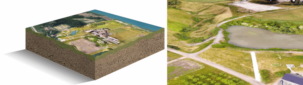 Vesistöpolun digitaalinen versio muodostuu kevään 2025 aikana. Oikealla lähikuva kuvantamisen avulla muodostetusta pistepilvestä. Pistepilvi ja korkeusmalli kuvaavat alueen pinnanmuotoja tarkasti.